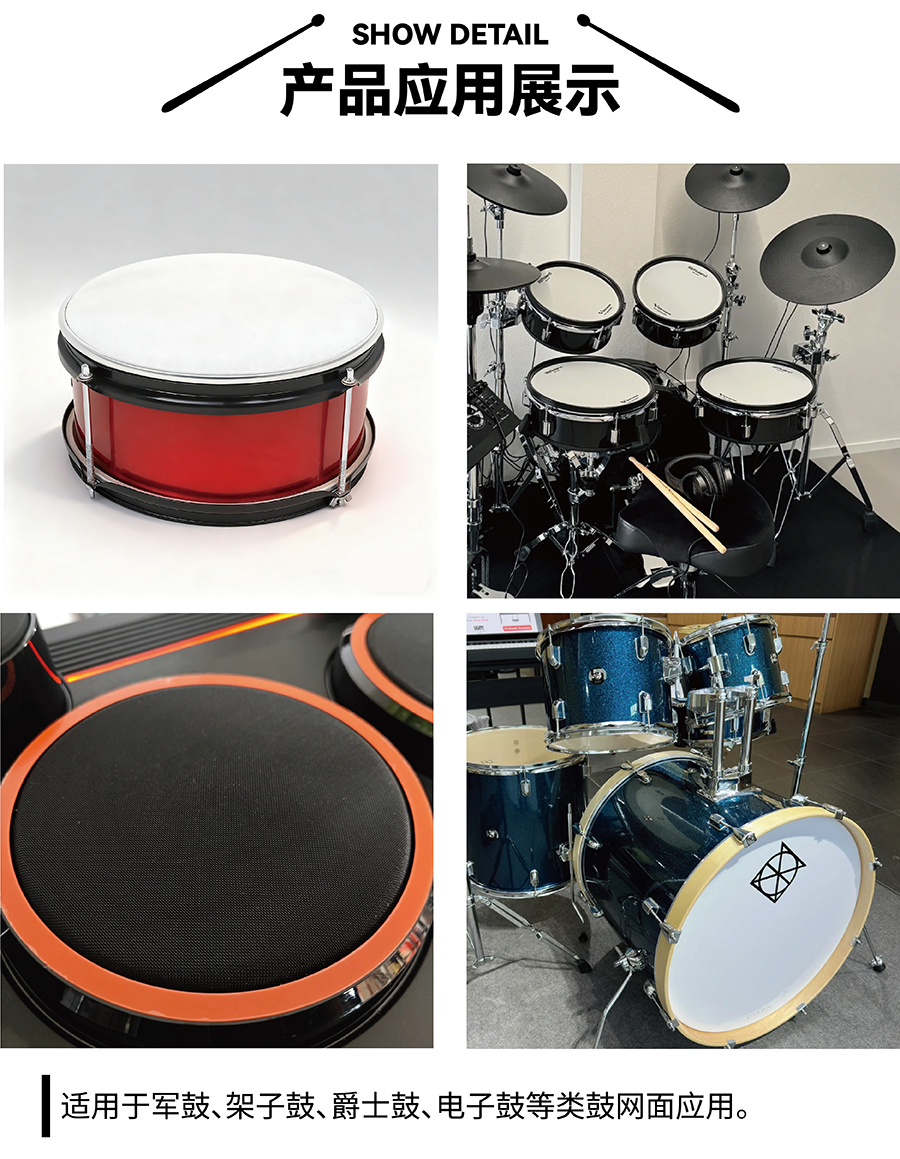 鼓皮丝网是覆盖于鼓皮表面或鼓腔外侧的防护与声学辅助配件,主要采用尼龙、聚酯或特殊化纤材质经精密编织制成,核心定位是 “保护鼓皮 + 优化声学表现”,尤其以硬挺质感为核心优势,适配架子鼓、非洲鼓、手鼓等多种鼓类乐器。
